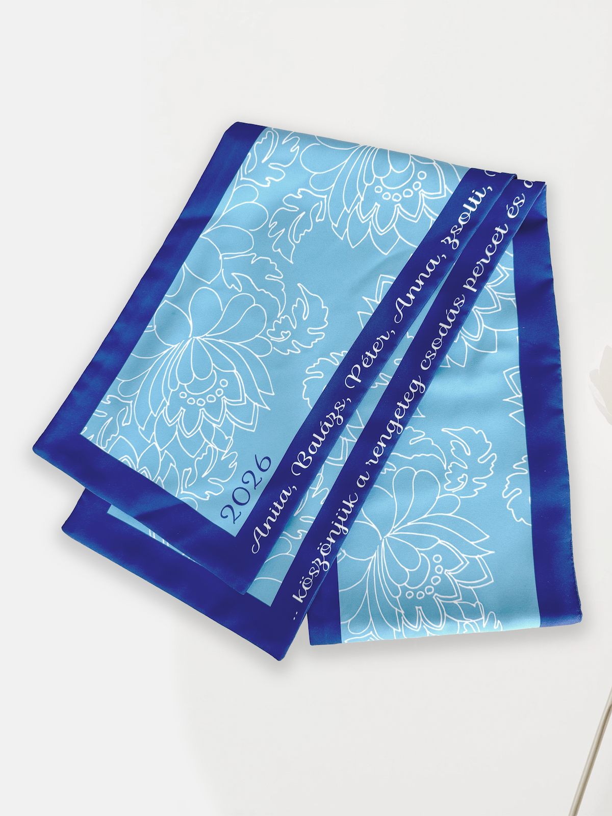 Anyaga: A sál egyik oldala egyedileg nyomtatott, így akár eltérő szöveg is kerülhet. A másik oldala egyszínű szatén.100% poliészter)