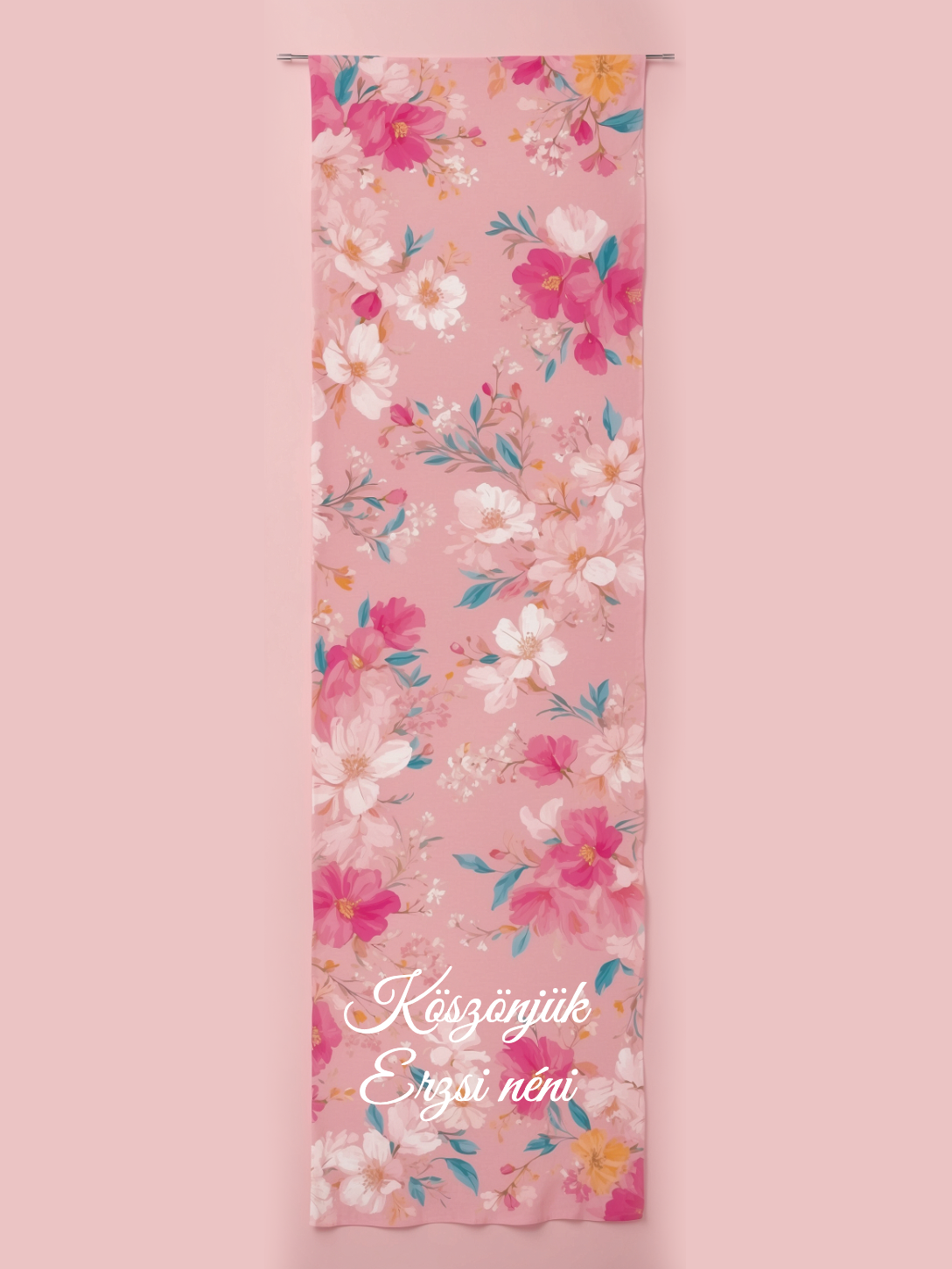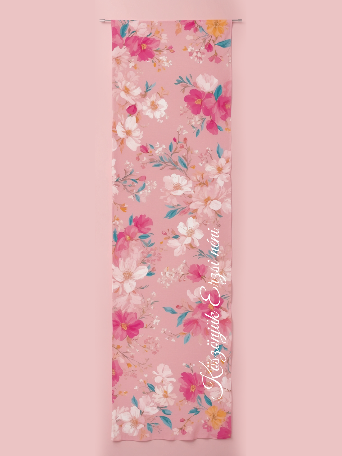 Anyaga: dupla rétegű, lágy esésű szatén. A sál egyik oldala egyedileg nyomtatott, így akár eltérő szöveg is kerülhet. A másik oldala egyszínű szatén. (100% poliészter)