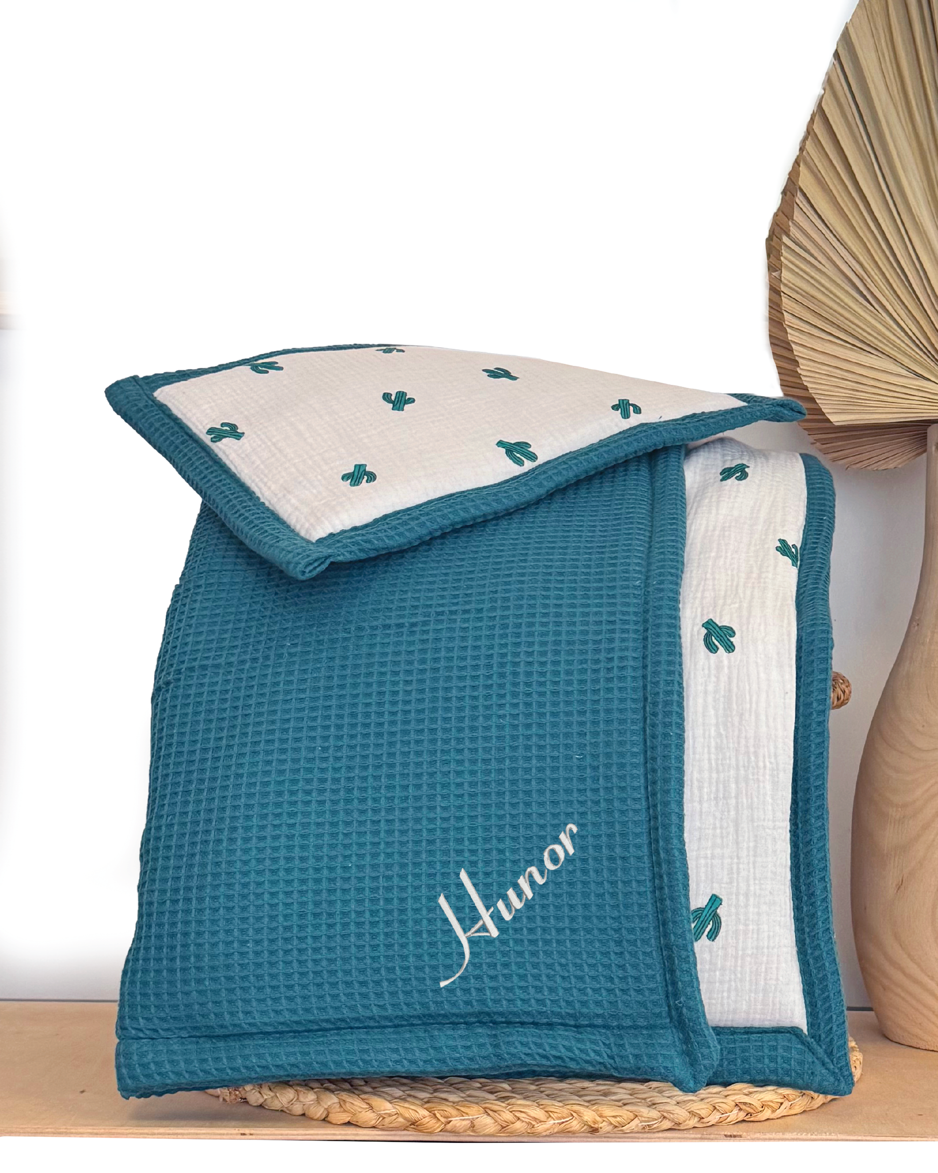 A baba nevével díszített babaágynemű szett, takaróval és párnával. Az ágynemű bélelt, így a mosása könnyű, nincs szükség külön huzatra.